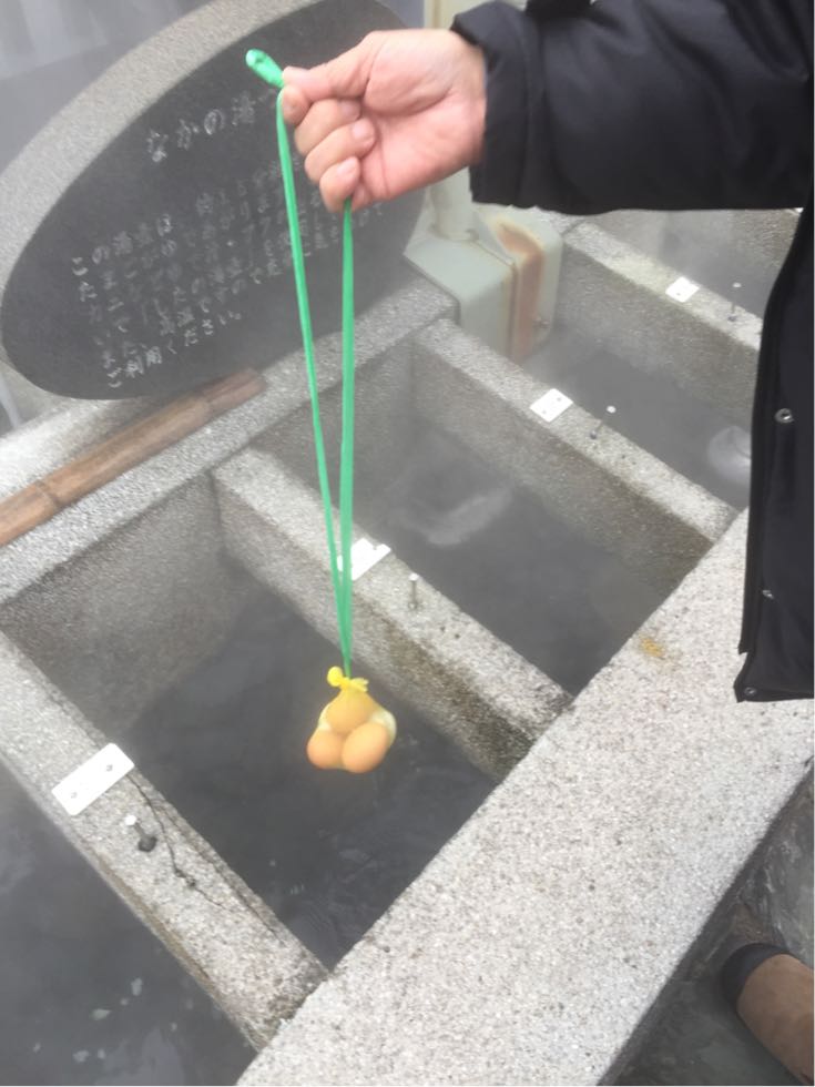 この卵を温泉(98度)真ん中の釘に引っ掛けておいてお湯に浸して15分待ちます♪