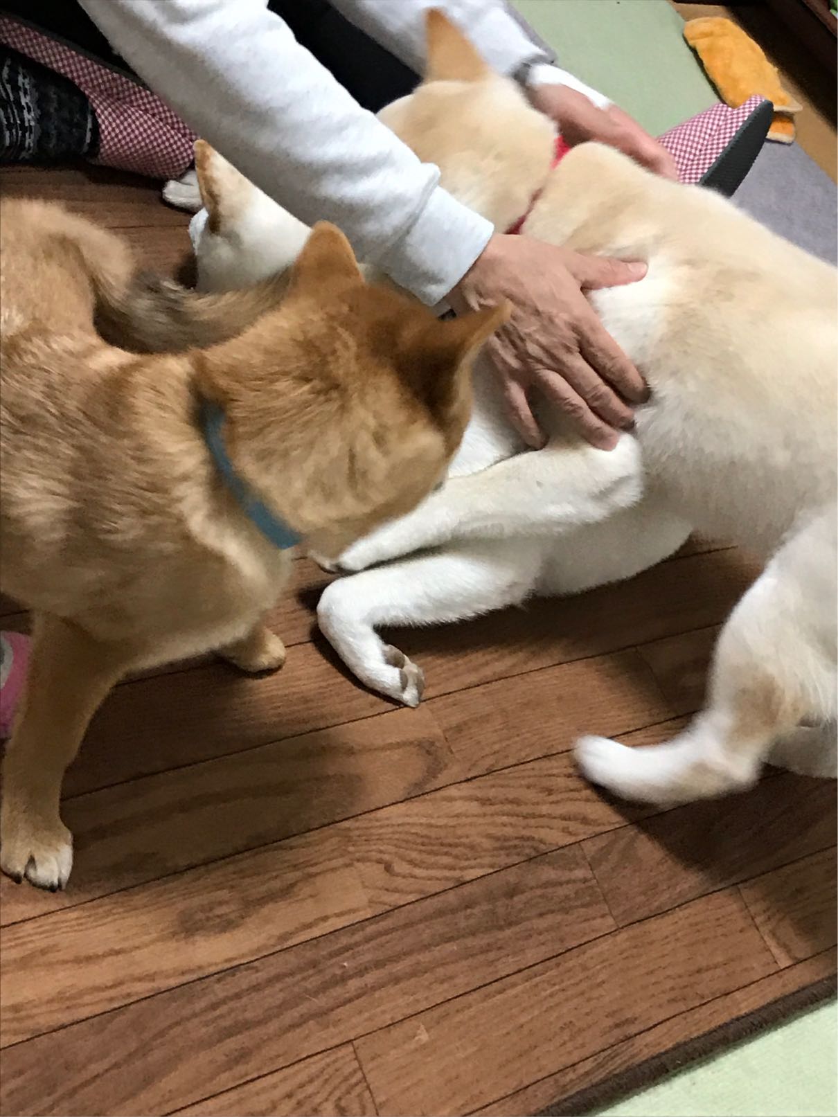 ランで栗君を可愛い❤可愛い❤って撫でてたら珍しく響くんが割り込んできて珍しく私に体をくっつけて仰向けになってご機嫌さんだったのでビックリポンだったんです。