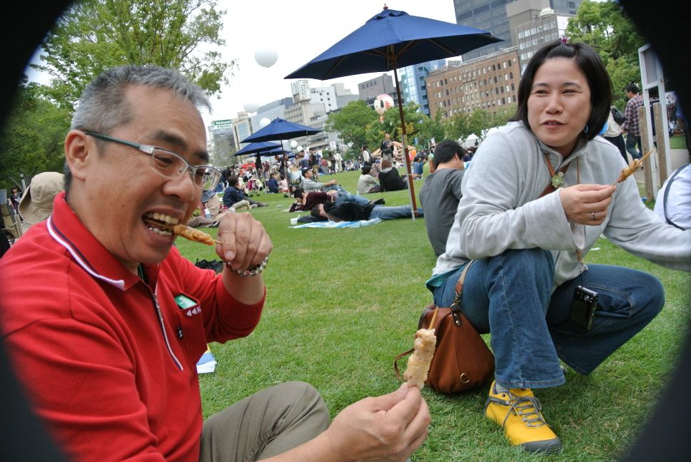 少し歩いた私たちは 芝生でビール片手に焼き鳥 タイム♪