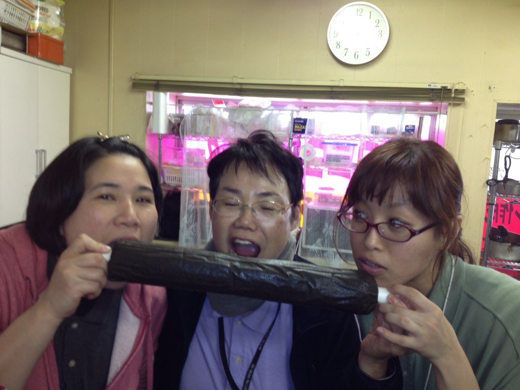 大口を開けてかじる杉かなちゃんと最年長スタッフ(笑)
