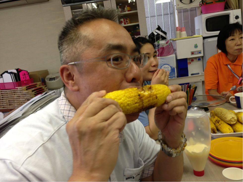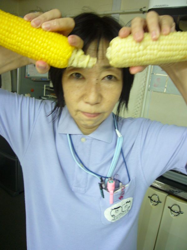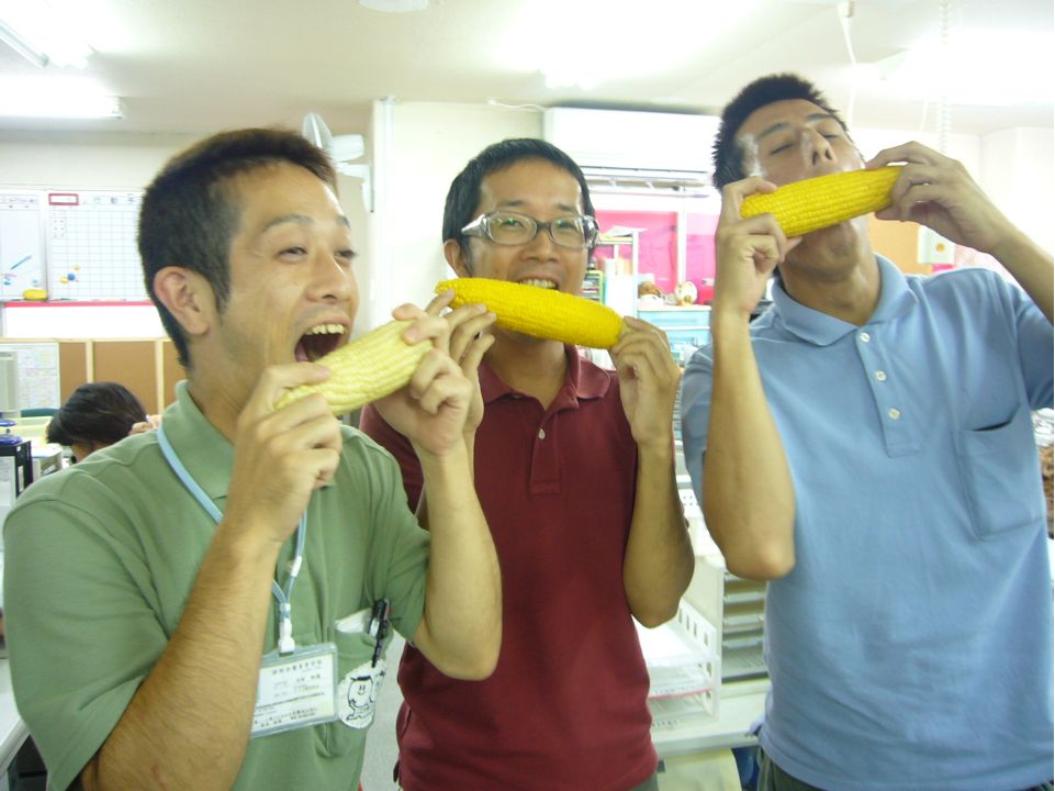 茹でたとうもろこしにテンションアップのスタッフたち♪