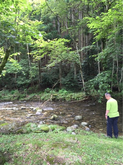 靴下を脱いでズボンを折り曲げて川の中に入ろうとする社長を