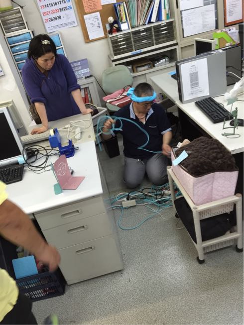 机の配置が終われば社長がパソコンの配線をつないでいきます。