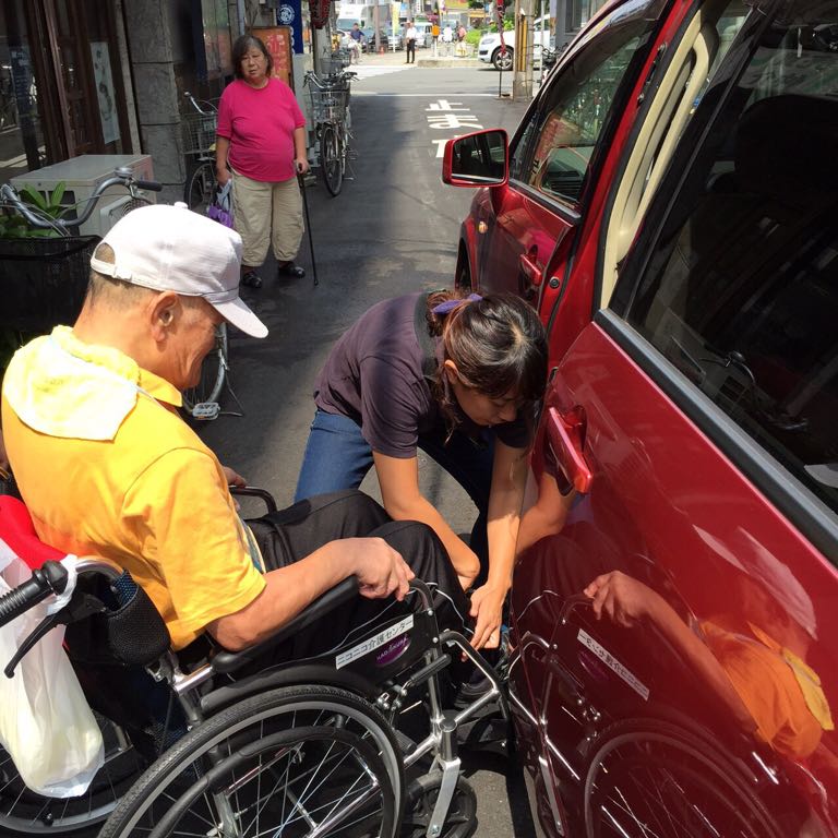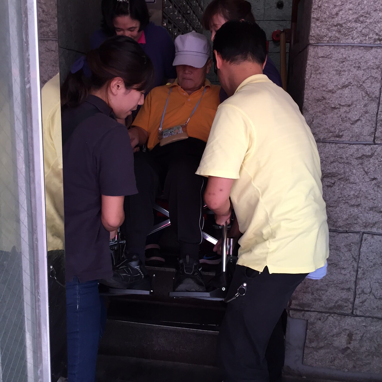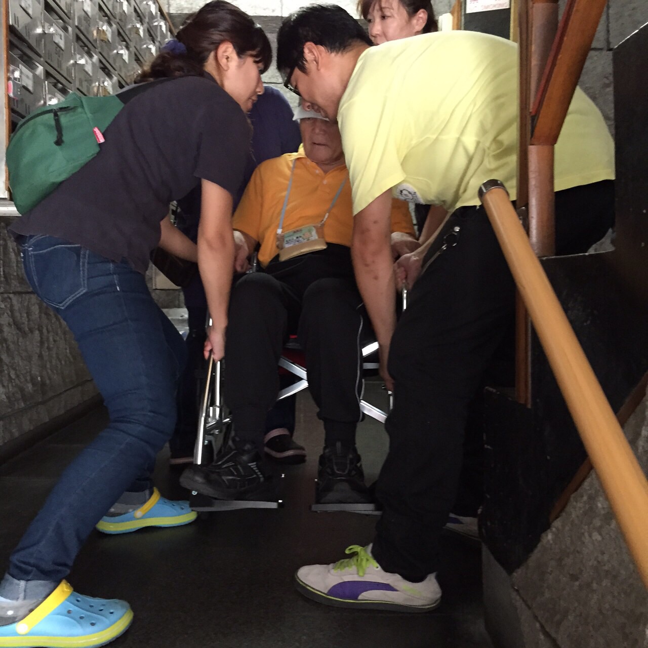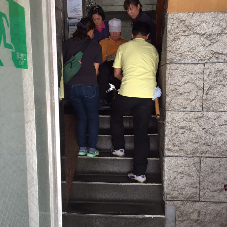 帰りにはもう、歩けなくなり、みんなで狭い階段を車いすのまま担ぎます。