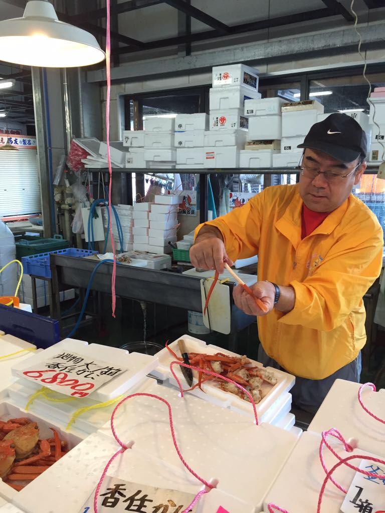 名物大将が、試食のカニを剥いてくれました。