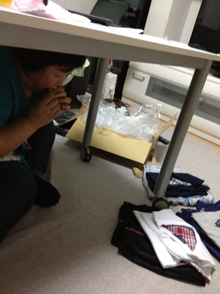 ソファーの下で値札を切って、上下のセットをしている最中に雷