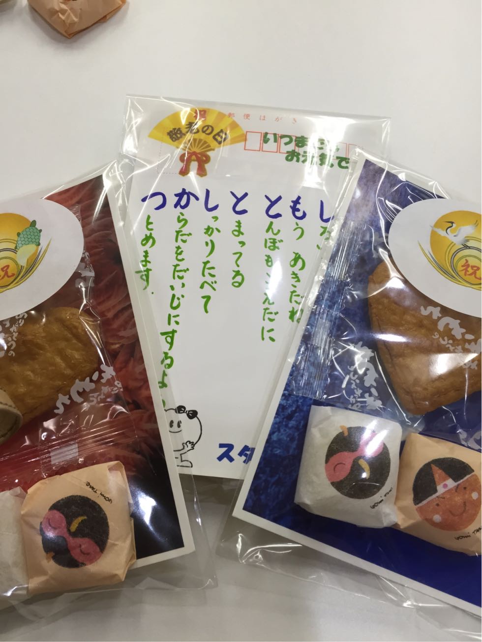 各利用者さん向けには 紅白のきび団子と❤型のおせんべいを