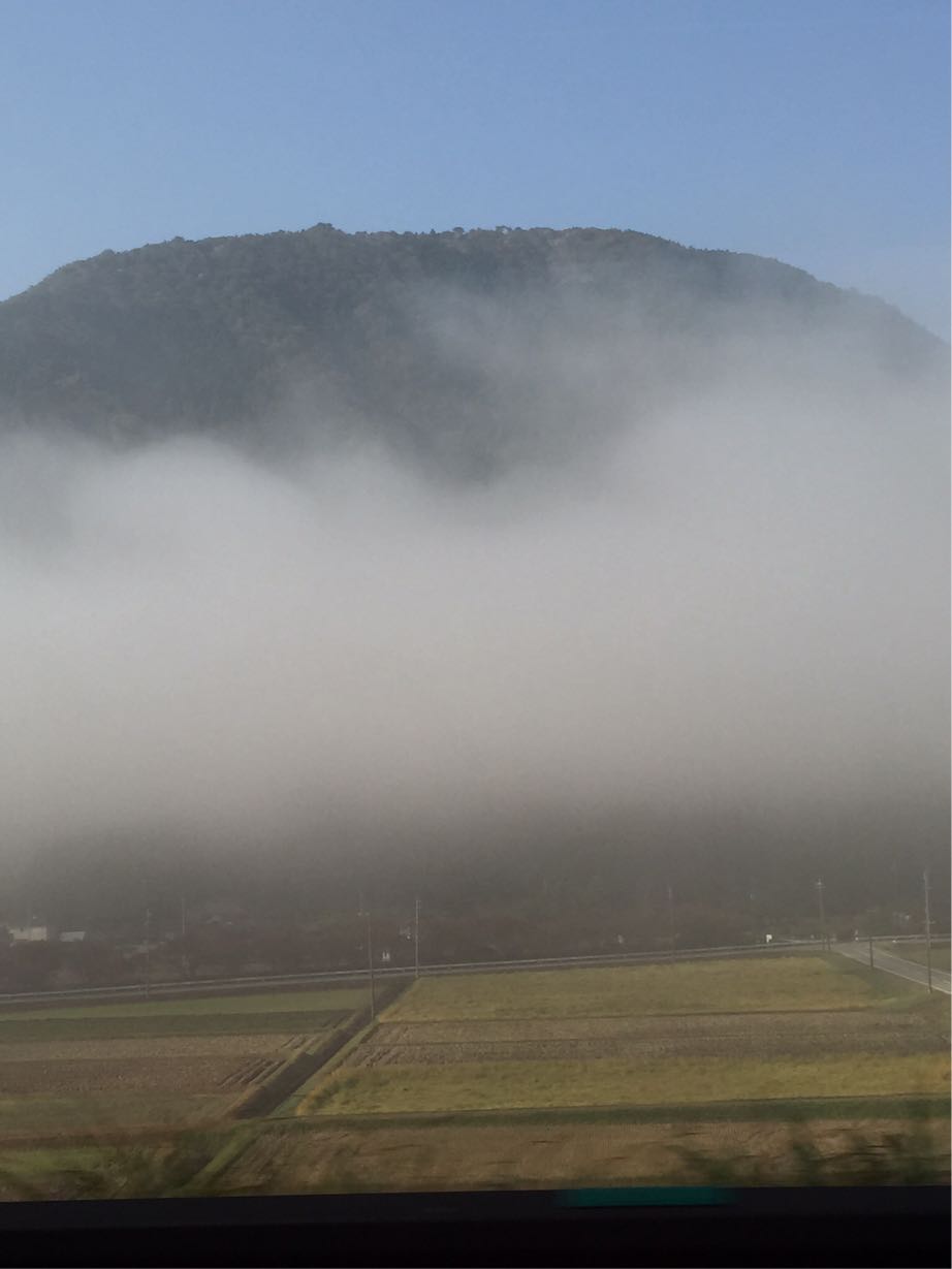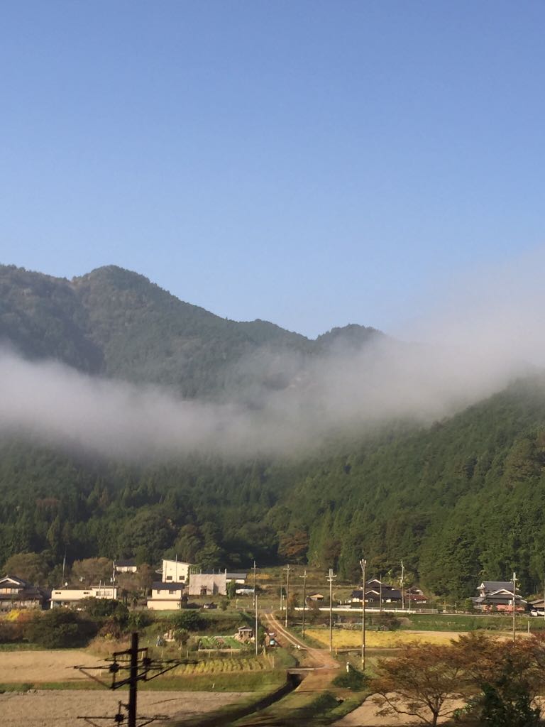 青い空と緑の山と霧 ごみごみした大阪と違った景色と色