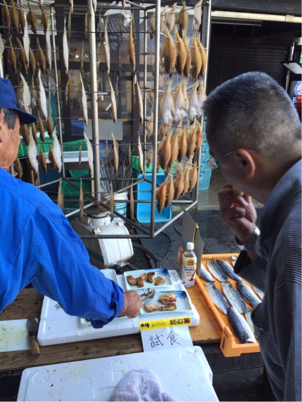 外では、カレイやサバの干物が試食できます。