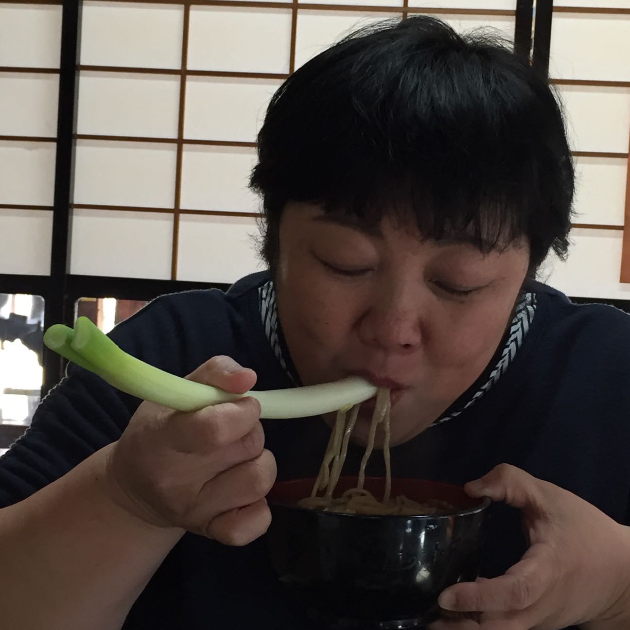 左手にネギ持って同時に食べました。