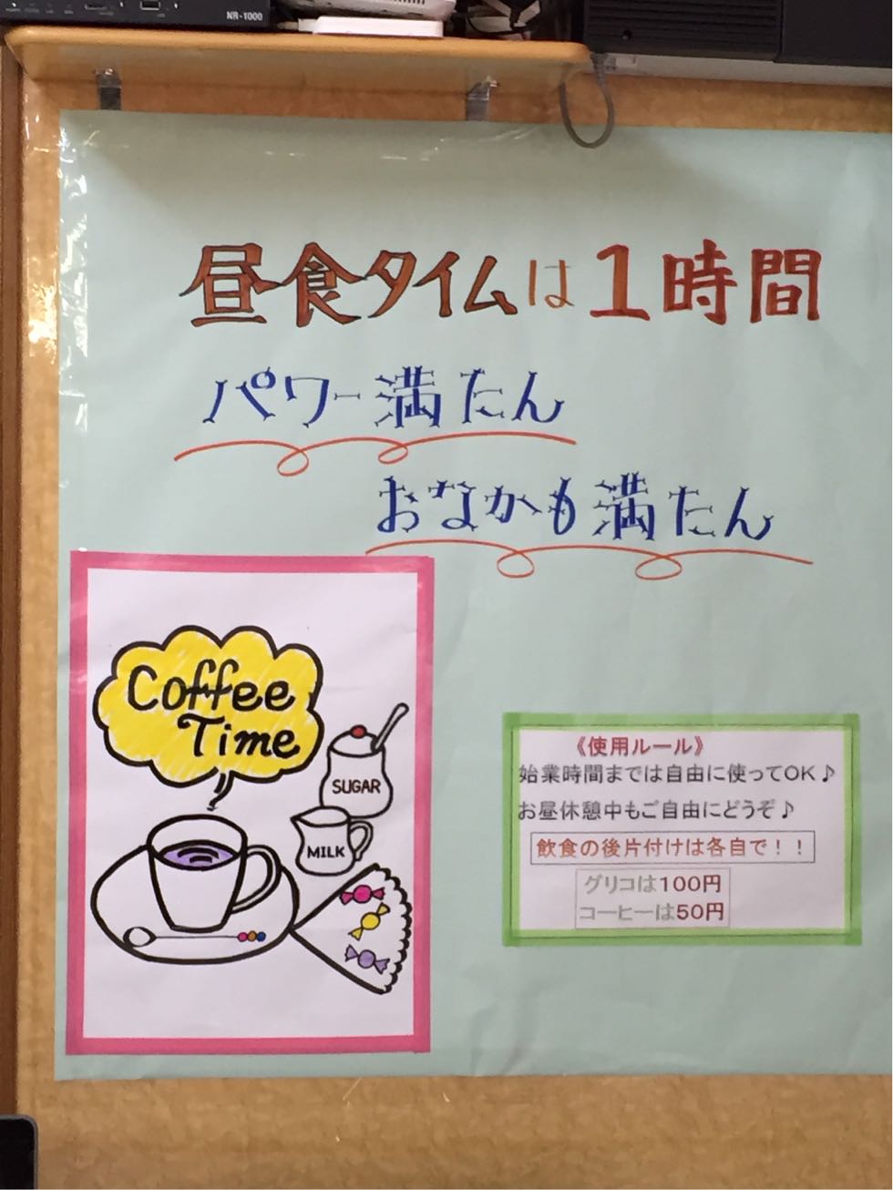 この部屋にグリコやコーヒーメーカーを置き、ゆったりと休憩タイム♪