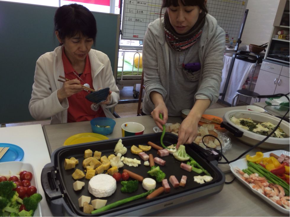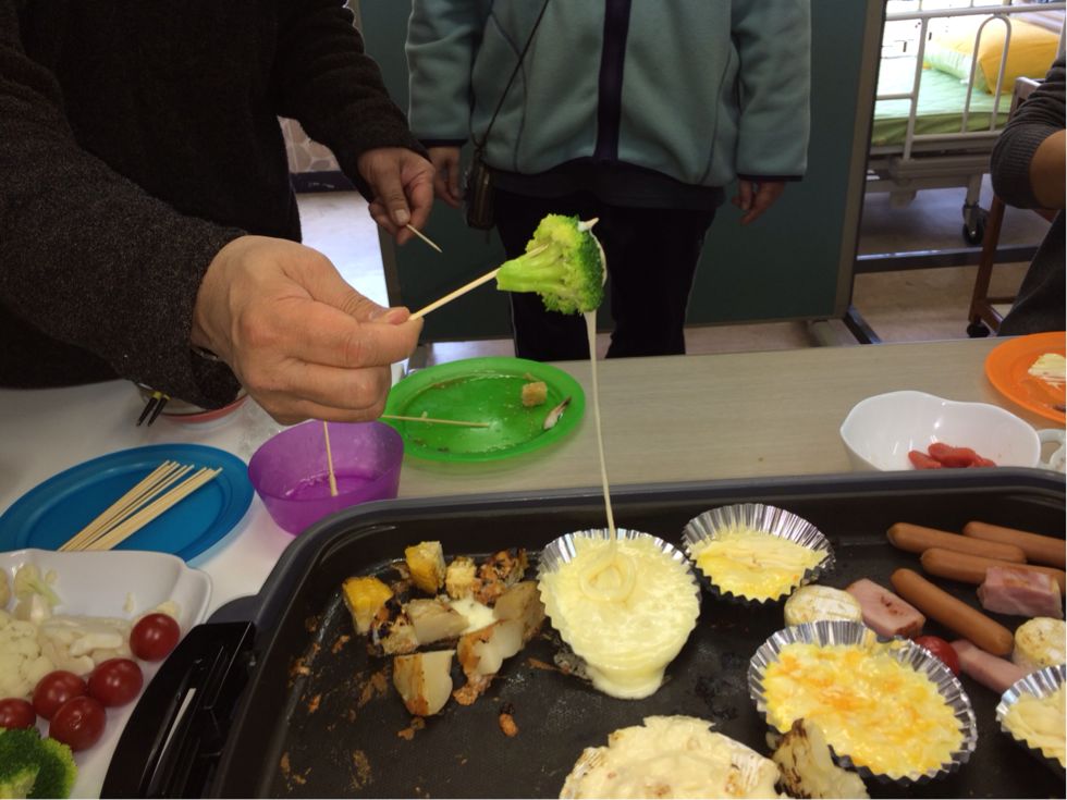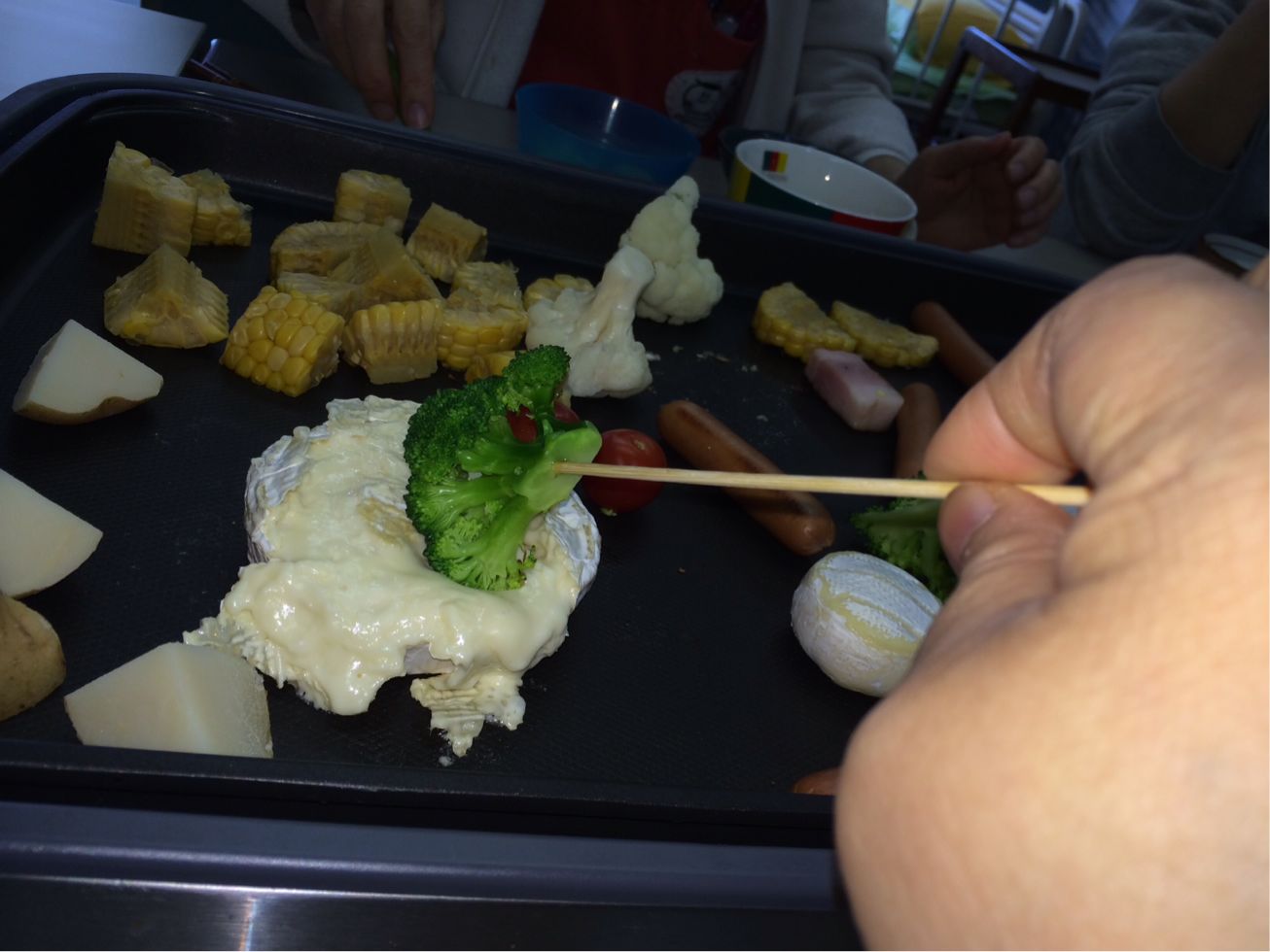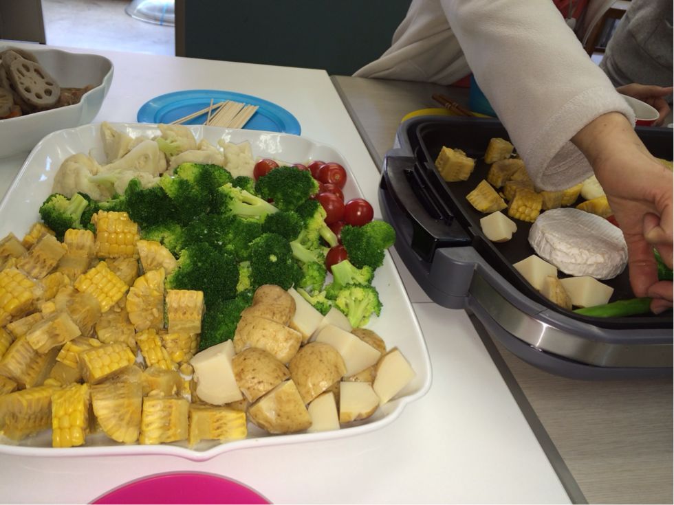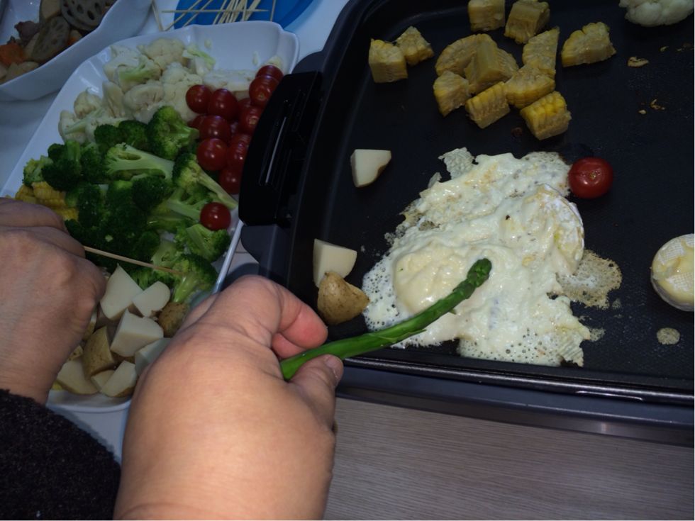 チーズが溶けるまで、ホットプレートで野菜たちを温めます