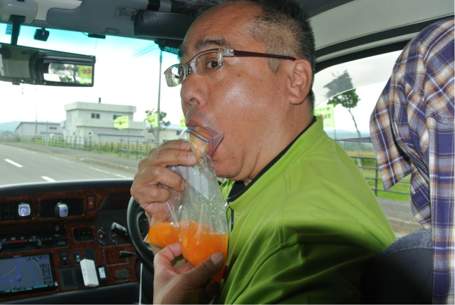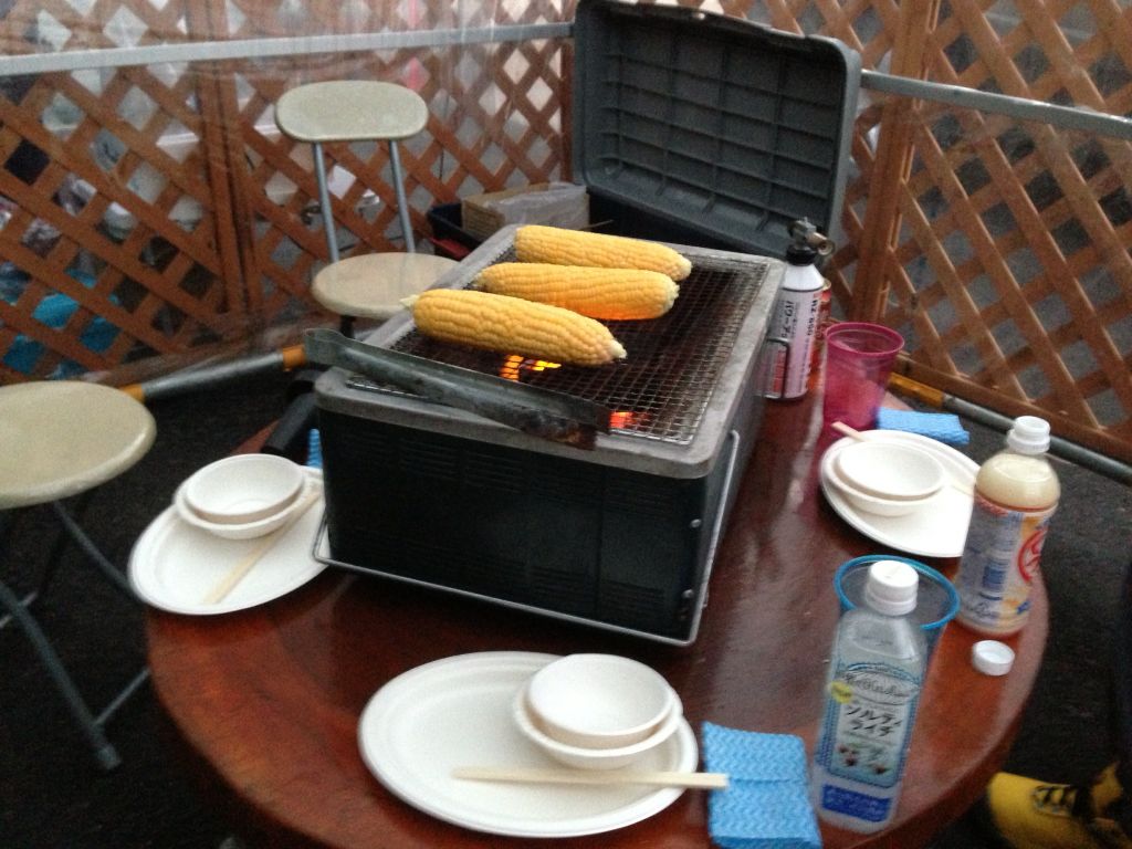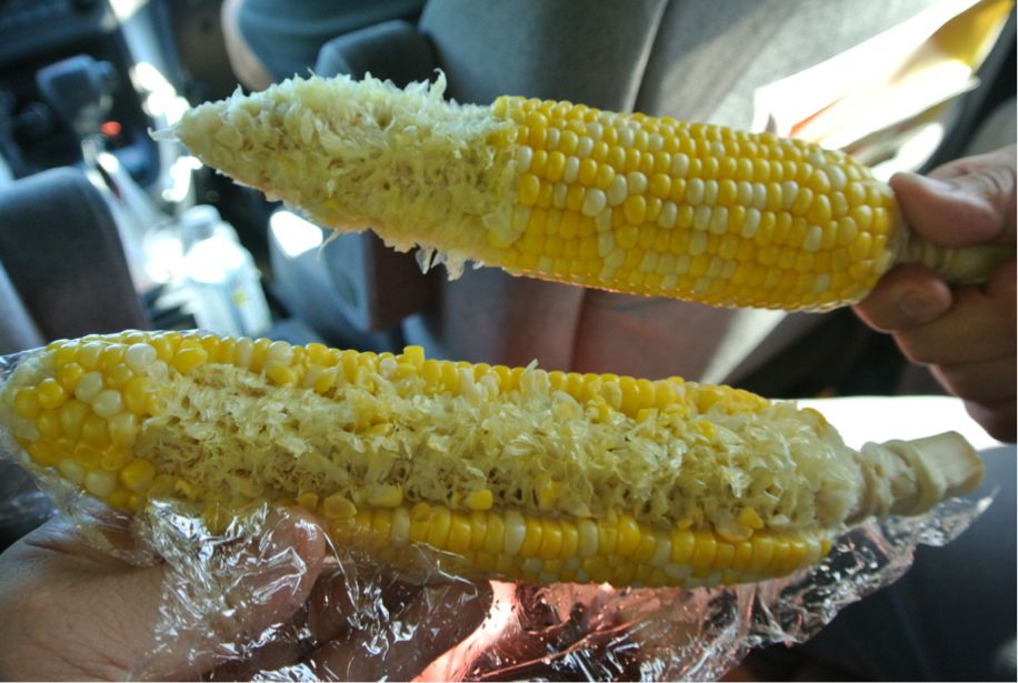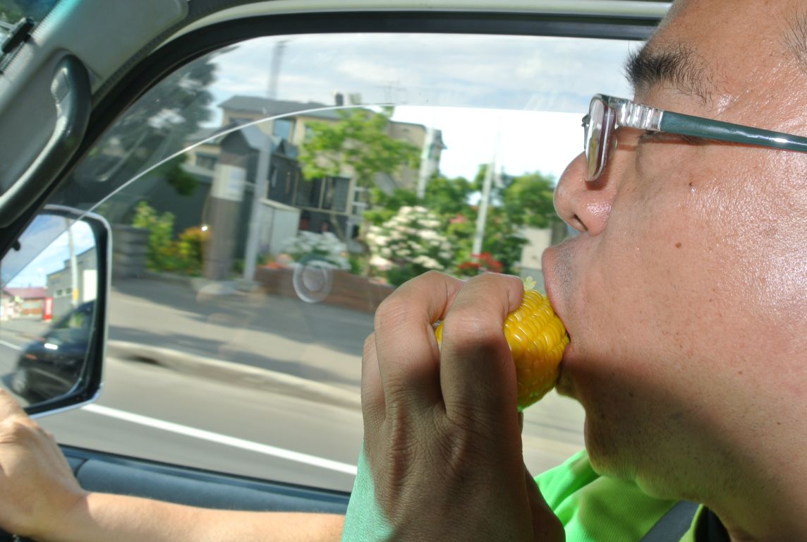 昼食は車の中でとうもろこし