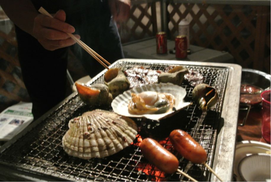 とうもろこしやつぶ貝やホタテなどが炭火で焼かれます