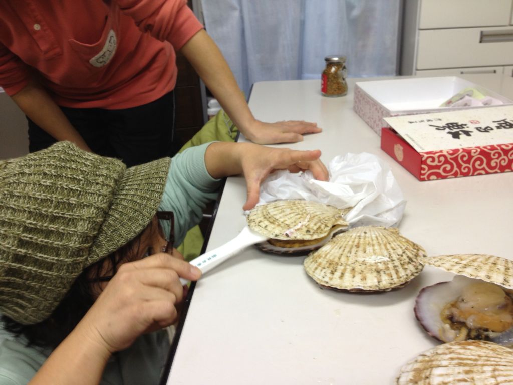 「ホタテを殻付きで焼いて食べたい人~~」って聞くと16人手が上がりました。