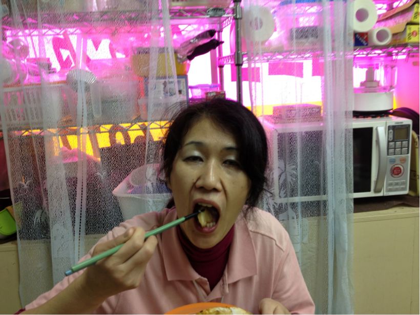 寝ているMさんの口に朝から晩までサンドイッチやお刺身やお菓子など